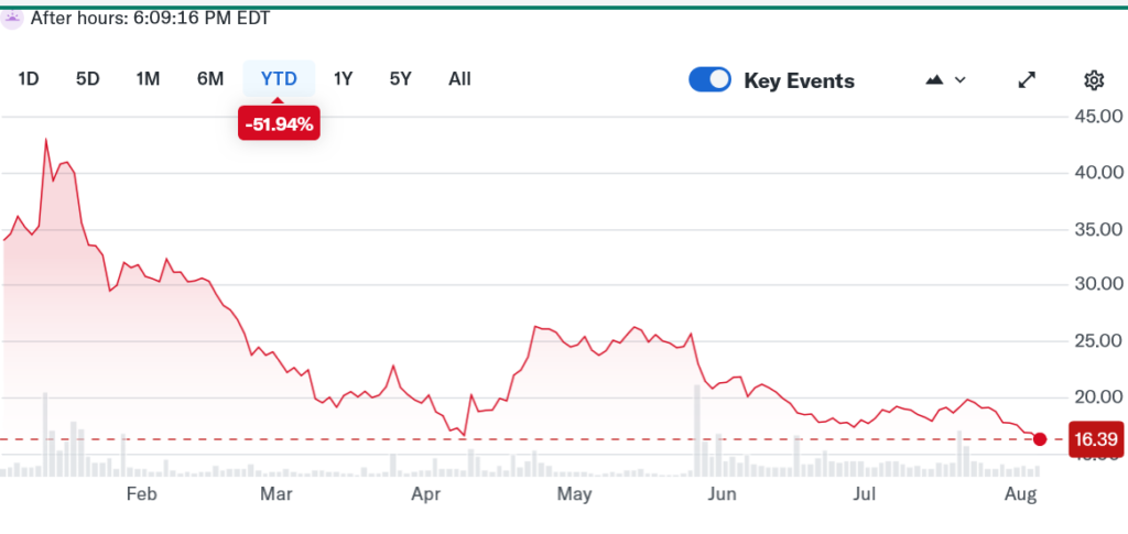 Trump Media, the stock for Truthsocial.com, hit its lowest point since April at $16.39.
