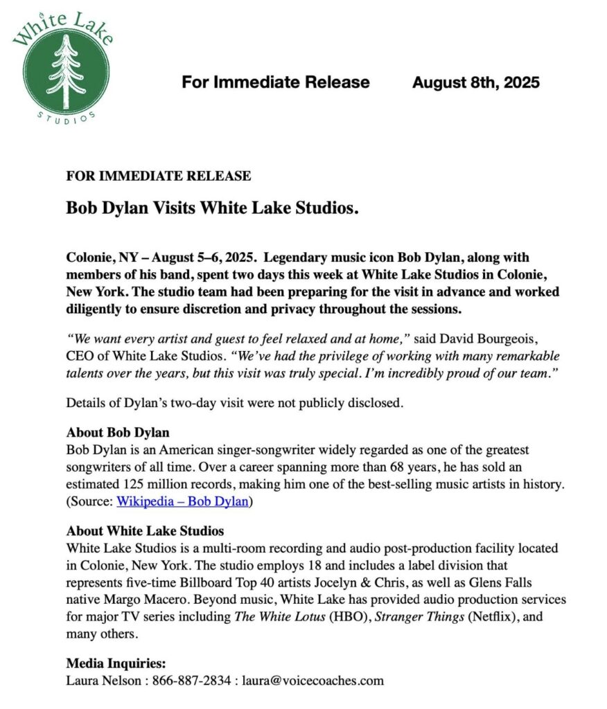 Now White Lake Recording Studios in Albany, New York reports that Bob and the band worked there recently.