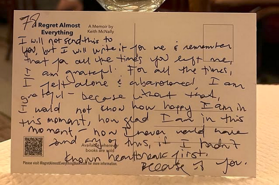 McNally also runs a self-deprecating, refreshingly candid Instagram account where nothing is off limits. Today he offers this post card from his first ex wife, Lynn, who won a bunch of the restaurants they started together in their long ago divorce. It may be the postcard of the year. And McNally gets kudos for publishing it.