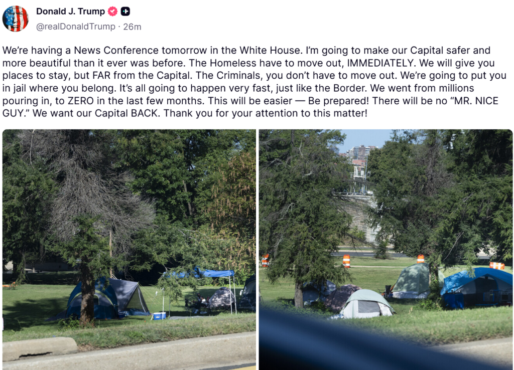 “I’m going to make our Capital safer and more beautiful than it ever was before. The Homeless have to move out, IMMEDIATELY. We will give you places to stay, but FAR from the Capital. The Criminals, you don’t have to move out. We’re going to put you in jail where you belong. It’s all going to happen very fast…”