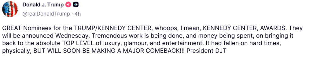 Trump sneeringly calls it the “Trump/Kennedy Center” just to get attention. He also claims the theater complex was run down or in some kind of financial trouble before he arrived like Mighty Mouse to save the day.