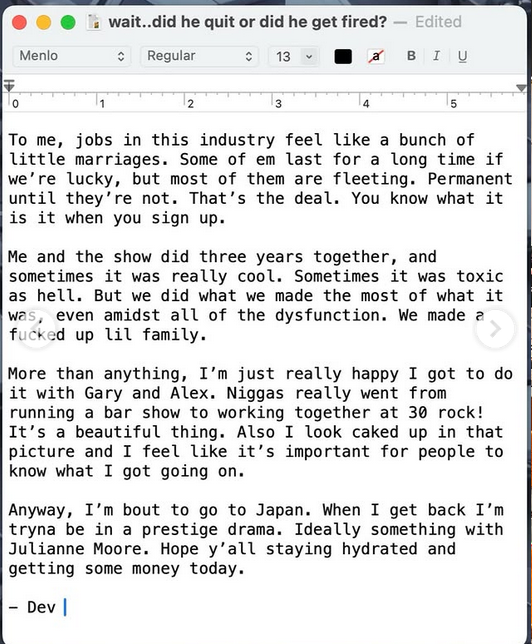 Gone today is three year vet Devon Walker, who was fine but never broke out like Sarah Sherman or Marcello Hernandez. Two writers also exited.