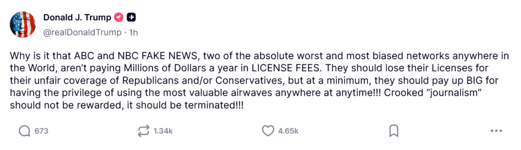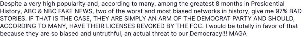 His latest subjects: NBC and ABC News. He hates them. He says they should lose their licenses. He omits CBS – which he thinks he now owns — as well as house organ Fox News, plus CNN and MSNBC.