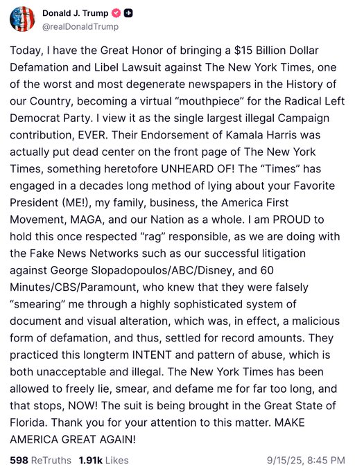 This insane lawsuit and social media post are only part of the freeze Trump is attempting on the right to speak up. Critics of just murdered blogger and right wing activist Charlie Kirk are being denounced and losing jobs in many quarters not just in the media. Two hundred and fifty years of history and law are now threatened by one very mentally ill mad man. And it’s only getting worse.