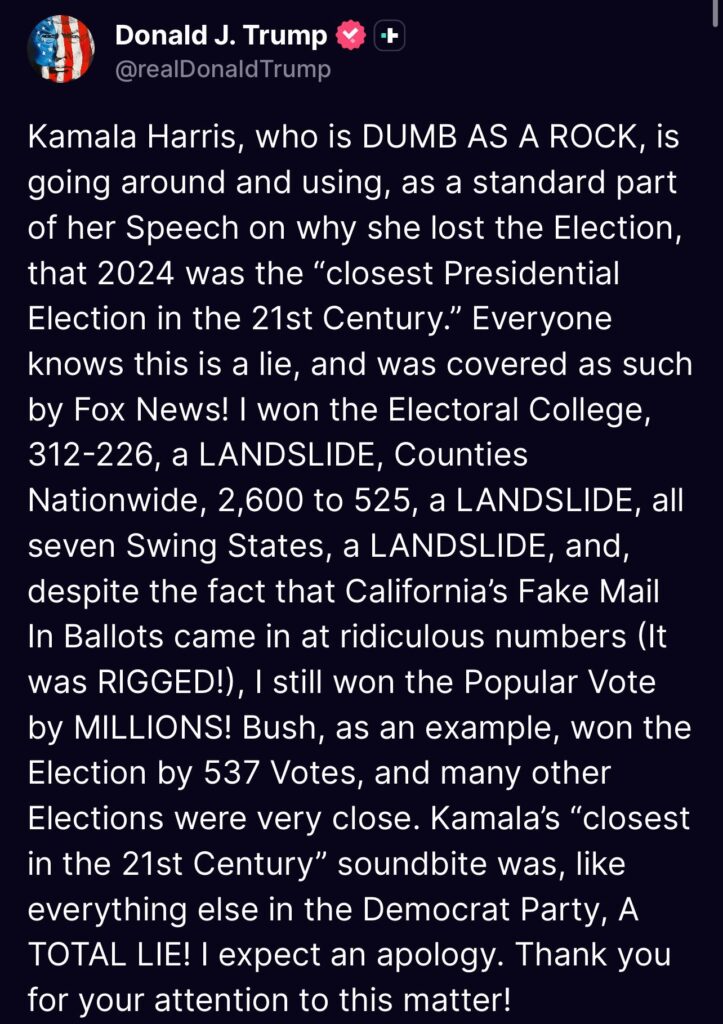 As usual, he’s obsessed with numbers. He claims he beat her in the 2024 popular vote by millions.”