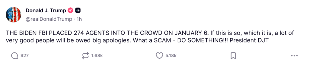 “THE BIDEN FBI PLACED 274 AGENTS INTO THE CROWD ON JANUARY 6. If this is so, which it is, a lot of very good people will be owed big apologies. What a SCAM – DO SOMETHING!!! President DJT”