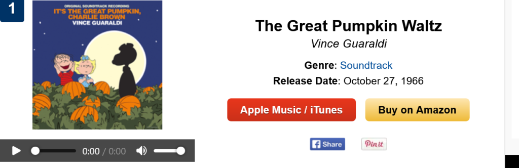 Meantime, the single, “The Fate of Ophelia,” has been usurped at number 1 on iTunes by Charlie Brown. “The Great Pumpkin Waltz” by jazz legend Vince Guaraldi, released in 1966, is at the top of the chart. Peanuts has scared off Taylor Swift!