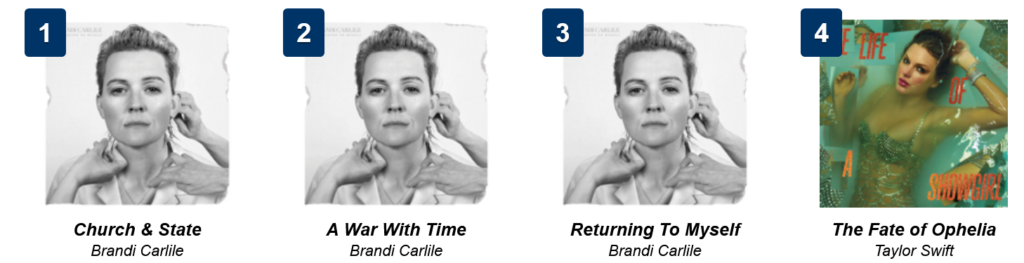 Carlile has posted three songs — “Church & State,” “A War with Time,” and “Returning to Myself” to the top of iTunes.