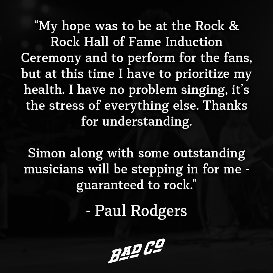 Paul Rodgers, the great leader of Bad Company and Free, will miss the Rock and Roll Hall o Fame induction ceremony this weekend in Los Angeles.