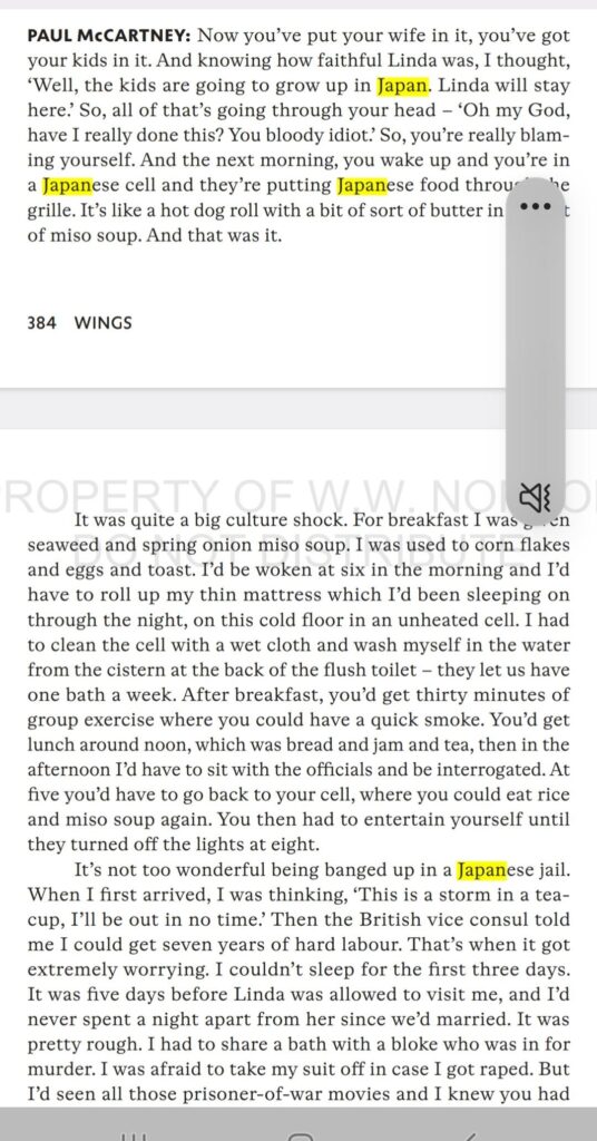 There’s a long passage of Paul talking about his 1980 arrest in Japan for trying to get a lot of marijuana through customs. He spent nine days in jail. He was booked for a Wings tour but says now he didn’t think the band was rehearsed enough and didn’t want to be there. He thinks he may subconsciously undermined the tour.