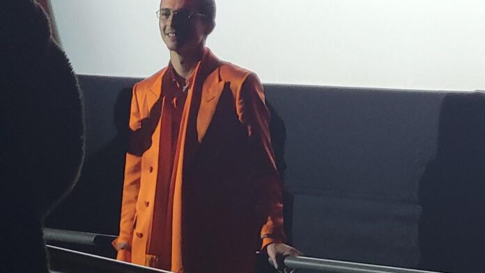 Chalamet — wearing his signature orange suit — participated in the introduction of the cast, which took less than five minutes, then disappeared. He was seen for a nanosecond stepping onto an elevator at the end of the film, then backed out when he saw people on the lift.