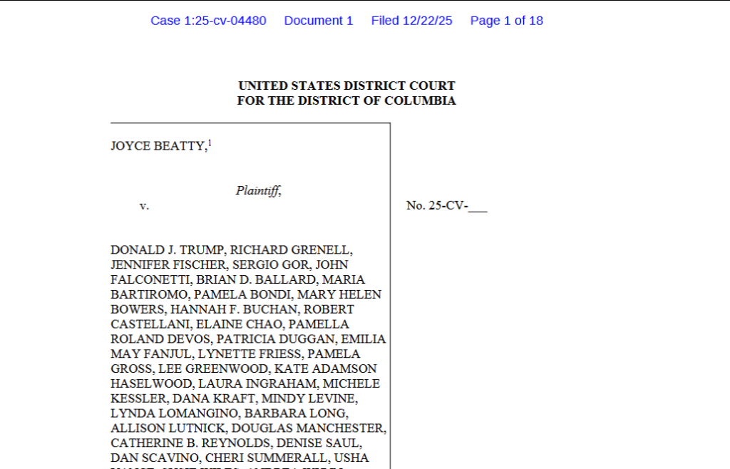 December 22, 2025 Congresswoman Joyce Beatty today sued President Trump and others to stop the unlawful renaming of the John F. Kennedy Center for the Performing Arts. The lawsuit was brought on behalf of the Congresswoman in her capacity as an ex officio trustee of the Kennedy Center by the Washington Litigation Group and Democracy Defenders Action. Congresswoman Beatty participated in the recent Board meeting and alleges she was prevented from speaking when she attempted to object to the renaming.