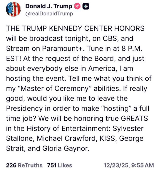 Donald Trump’s certain to be a debacle Kennedy Center Honors is on CBS tonight — by coincidence his new mouthpiece network.
