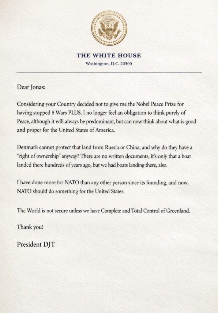 “Dear Jonas: Considering your Country decided not to give me the Nobel Peace Prize for having stopped 8 Wars PLUS, I no longer feel an obligation to think purely of Peace, although it will always be predominant, but can now think about what is good and proper for the United States of America. Denmark cannot protect that land from Russia or China, and why do they have a “right of ownership” anyway? There are no written documents, it’s only that a boat landed there hundreds of years ago, but we had boats landing there, also. I have done more for NATO than any other person since its founding, and now, NATO should do something for the United States. The World is not secure unless we have Complete and Total Control of Greenland. Thank you! President DJT”
