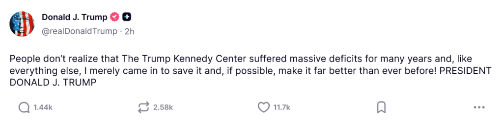 He writes, out of nowhere: “People don’t realize that The Trump Kennedy Center suffered massive deficits for many years and, like everything else, I merely came in to save it and, if possible, make it far better than ever before! PRESIDENT DONALD J. TRUMP”
