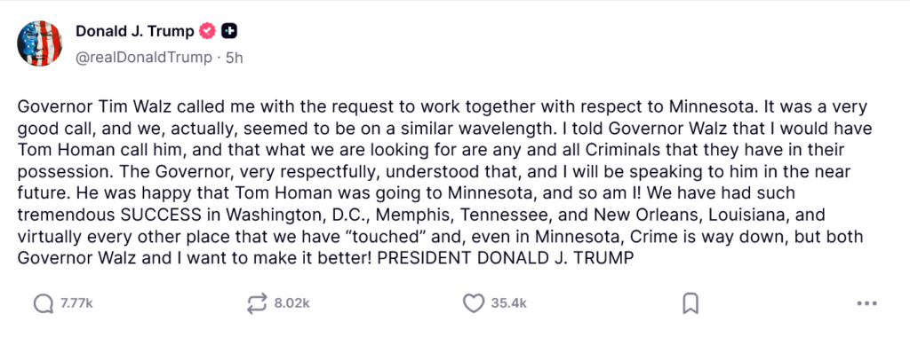 He sent out a peace offering to Minnesota governor Tim Walz today, perhaps also having an epiphany that he will be blamed for the deaths of Alex Pretti, Renee Good, and Keith Porter.
