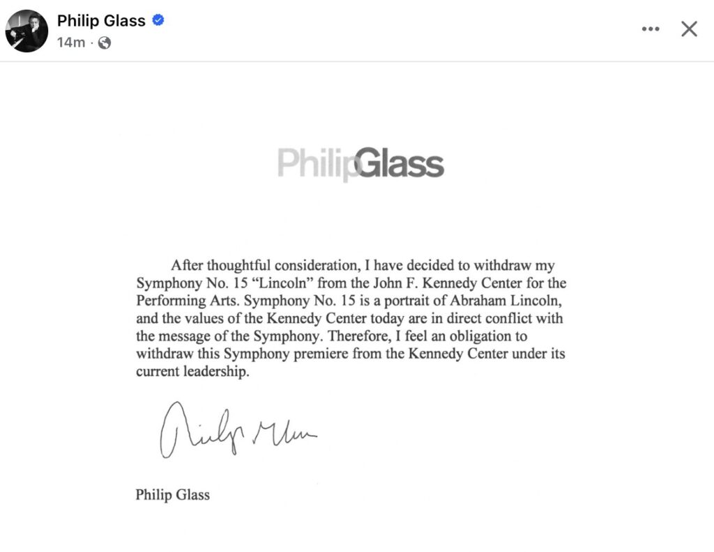 Famed composer Philip Glass is now removing the premiere of his “Lincoln” Symphony from the Center. He says the values of Lincoln are in direct conflict with those of the new Kennedy Center.