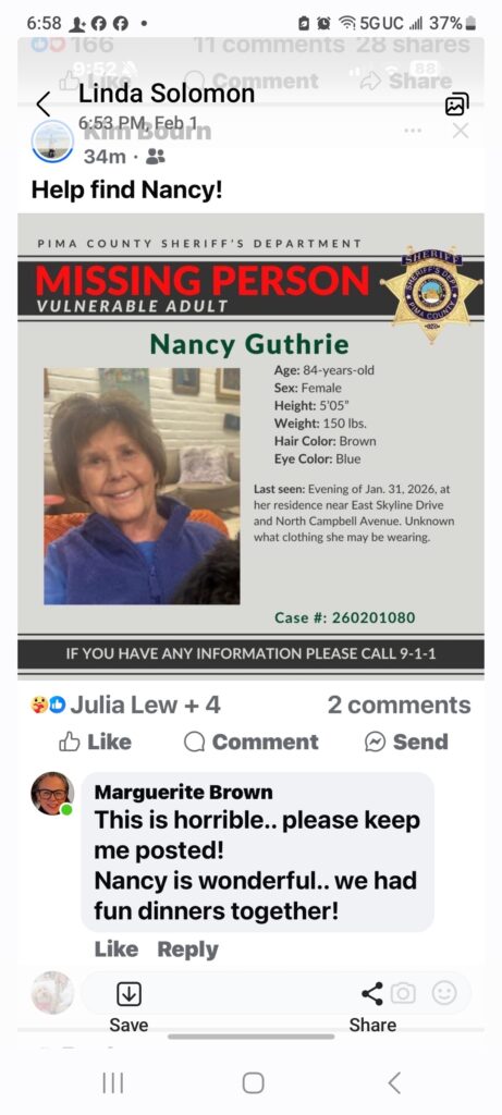 Today Show Host Savannah Guthrie Mother Missing in Arizona: Police Report for 84 Year Old