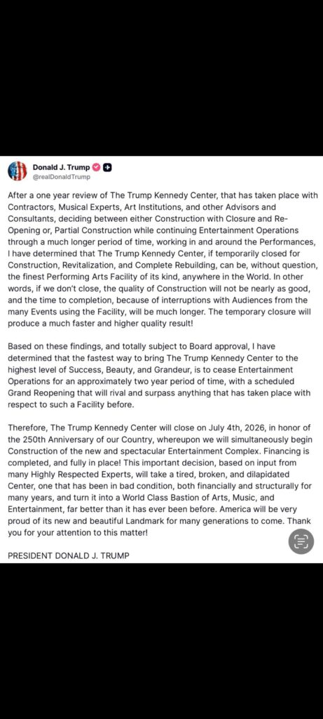 Trump has made such a disaster of The Kennedy Center that he had to close it. No one will perform there while he’s president.