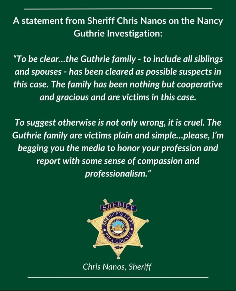 All of Nancy Guthrie’s relatives have been ruled out as suspects in her kidnapping.