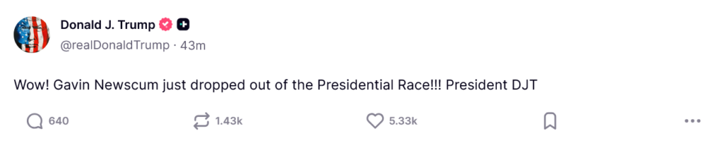 Trump Thinks California Governor Gavin Newsom — Who He Calls “Newscum” — Has Dropped Out of the Presidential Race (He’s Not In It)