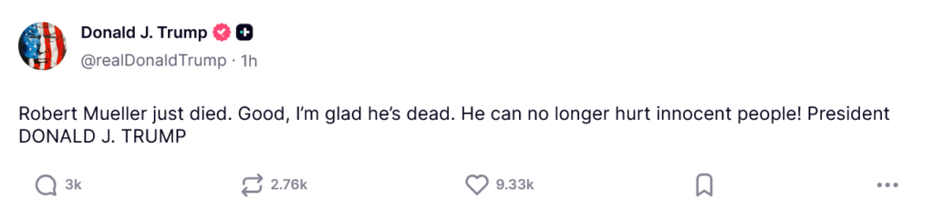 Donald Trump, already the worsrt person in the world, had this to say: “Robert Mueller just died. Good, I’m glad he’s dead. He can no longer hurt innocent people! President DONALD J. TRUMP”