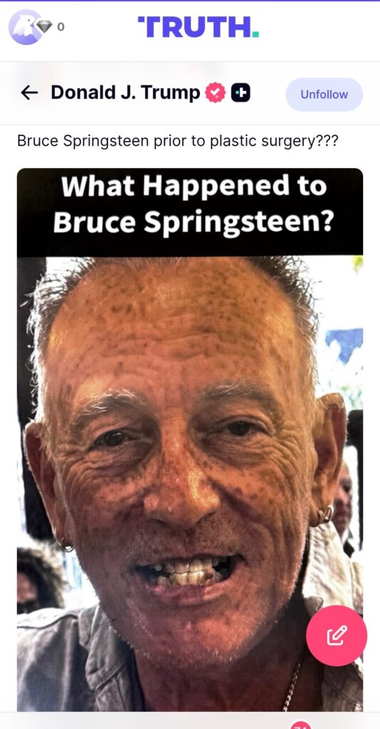He reposted a fake picture of a toothless, weathered Bruce Springsteen with the caption — before Bruce Springsteen’s plastic surgery.