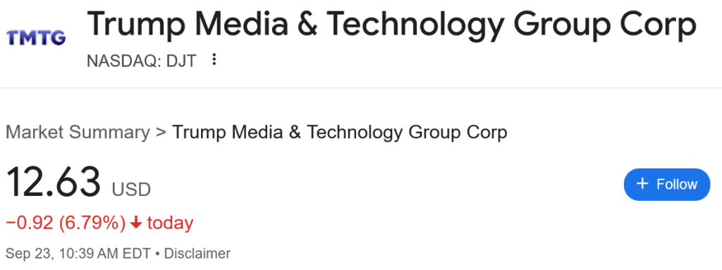 4PM UPDATE Trump Media closes the day at $12.74 after hitting an all time low of $11.75. What caused it to rebound by a dollar? Monkey business. It’s still at its low point. What is really going on? Did Donald start selling shares? To be continued…