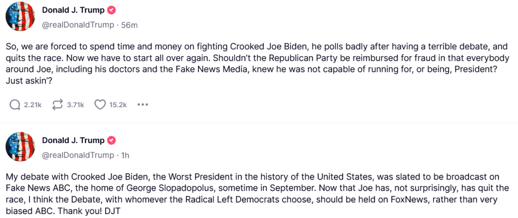 Donald Trump doesn’t want to debate Kamala Harris, especially on Fox News. On social media, Trump suggests that the 2nd debate should be moved to Fox News from ABC. He also suggests Republicans should be reimbursed for campaigning against Biden all this time. Trump is scared to death of Harris. She’s young, really smart, and vital. On a debate stage she will demolish him. Remember what she was like with Biden in the Democratic primary debates? When Trump starts lying, she will call his ass out instantly. As for the debate moving to Fox, that won’t help Trump. They dislike him as much as anything else. He criticizes them all the time. What he wants is a debate moderated by Tucker Carlson and Sean Hannity, or Viktor Orban and Kim Jung un. Good luck with that.