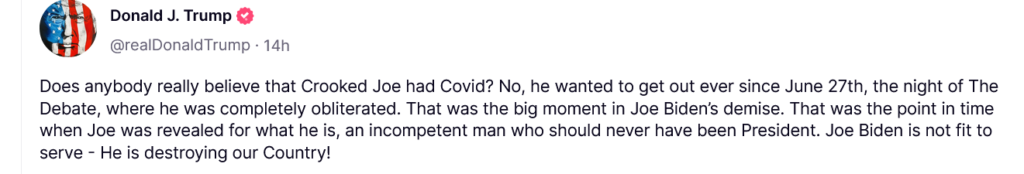 Trump is claiming Biden never had COVID and no one knows where he is. In fact, Biden does have COVID, and everyone knows he’s at home in Rehobeth Beach, Delaware.